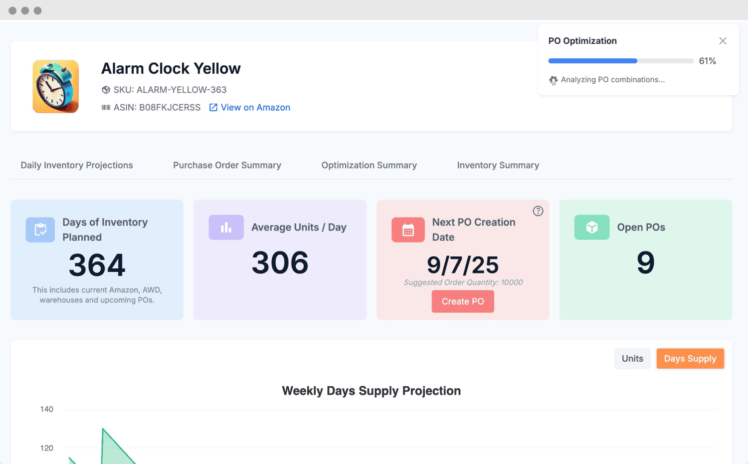 Never run out of stock again. Our AI analyzes your Amazon sales and predicts exactly when to reorder, eliminating costly stockouts.